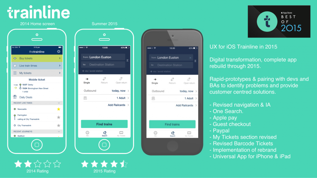We blew away internal targets on conversion and transition rates and won an Apple Best of 2015 award and were highly successful with App Store Optimisation. Trainline is now a standard bearer for start-up mentality in a corporate environment.